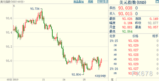 北京时间19:15,现货黄金下跌0.55%至1792.81美元/盎司;COMEX期金主力合约下跌0.79%至1794.2美元/盎司;美元指数上涨0.16%至93.030。