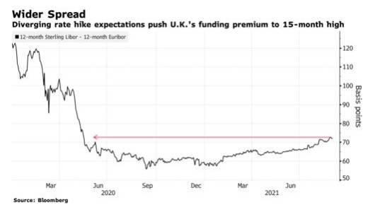 Robeco基金经理Bob Stoutjesdik评论道,Libor和Euribor之间的利差走阔,是由于市场基于对英国央行未来加息预期的定价。市场目前预计英国将于2022年5月首次加息15个基点。