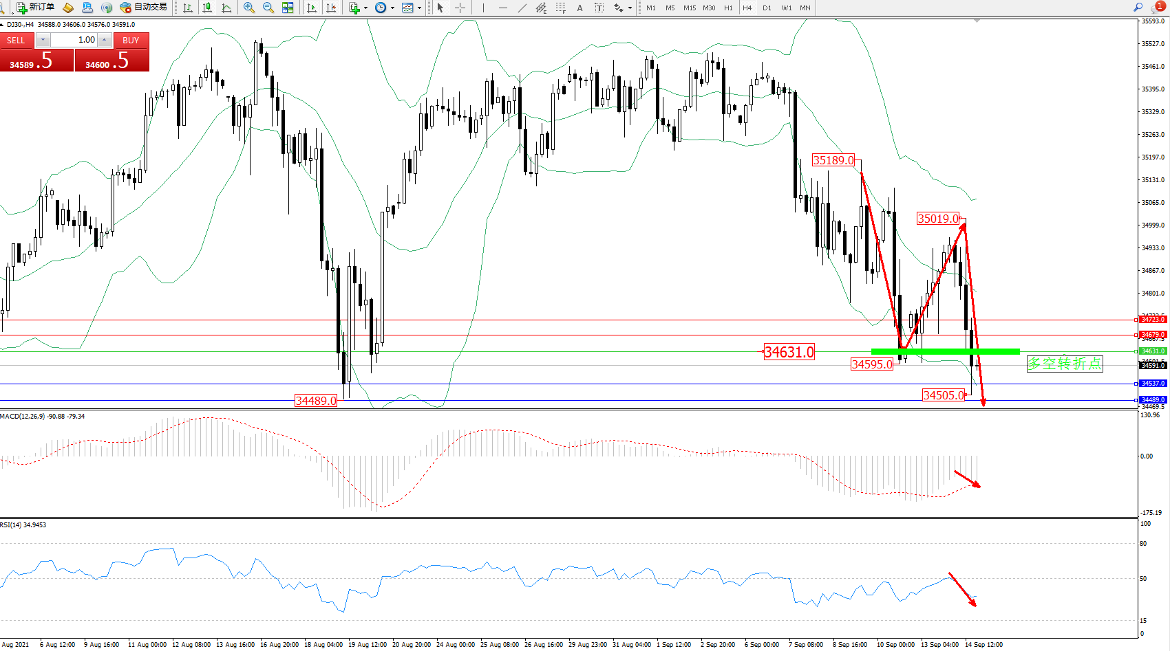 技术点评:空头动力延续布林带指标通道中下轨区间持续巨震下探,空头动力强劲,低位抵达34505位置后开始不断下行,前期低位34489位置近在咫尺破位在即,布林带指标呈下行趋势走势良好,MACD指标处于空头且有持续整理后缓慢下行,RSI指标处于50均衡线下方维持震荡向下移动中;