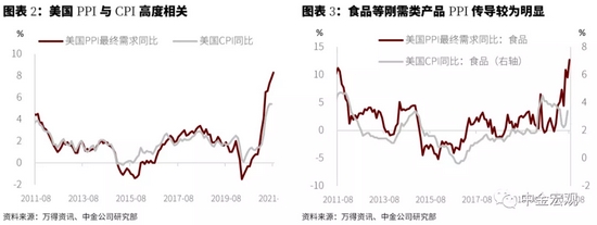 PPI走高对于CPI有何含义?首先,美国PPI与CPI高度相关,但因为统计方法不同,两者也有差异。PPI主要是从生产者的视角来观测价格,而CPI则是从消费者的视角。虽然视角不同,但二者覆盖的“篮子”有一定重叠。PPI个人消费部分的覆盖范围包括国内生产者(企业和政府)为家庭提供的所有可销售的产出,CPI的范围包括由企业或政府提供的商品和服务,但只包括由消费者直接支付的个人消费部分。PPI覆盖了大约72%的服务业,一些包括在CPI中的服务业,没有包括在PPI中。例如,CPI中权重最高的项目——业主等价租金(占比23.6%)就不包含在PPI中,权重约为3%的教育服务也不含在PPI中。而由企业或政府负担的医疗服务价格包含在PPI中,但不包含在CPI中。CPI还包括进口的最终商品与服务,而关注本地生产的PPI只包含进口的中间产品,这意味着输入性通胀对二者的影响有一定差异。PPI和CPI的调查时间窗口也不同,PPI的调查窗口为包含每月13日那一周的星期二,而CPI的调查则覆盖整个月。