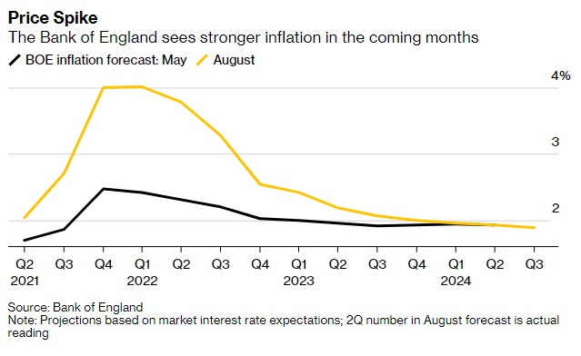 英国央行预测,到今年年底,通胀将达到4%,是其目标的两倍,然后在2022年和2023年回落。投资者开始预期,英国央行的政策制定者最早可能不得不在明年提高利率,以防止经济过热。