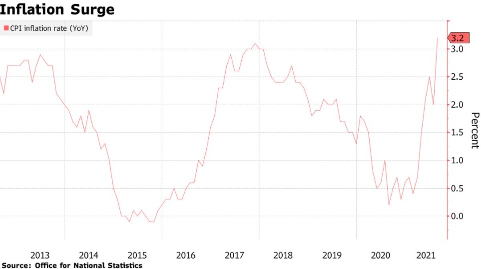 英国国家统计局周三公布的数据显示,英国8月CPI年率较上年同期上涨3.2%,为2012年3月以来的最大涨幅,此前一个月CPI增长回落至央行设定的2%的目标。同时该数据也超出了市场预期。