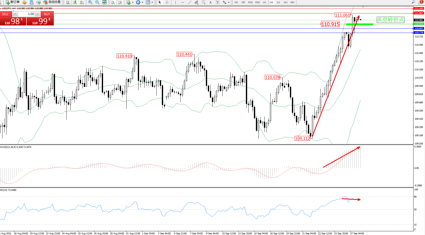 备选策略:110.915上方看涨,目标111.087、111.160