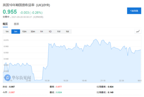 截止发稿,在英国央行行长贝利发表讲话后,英国10年期国债收益率回撤至0.955%。