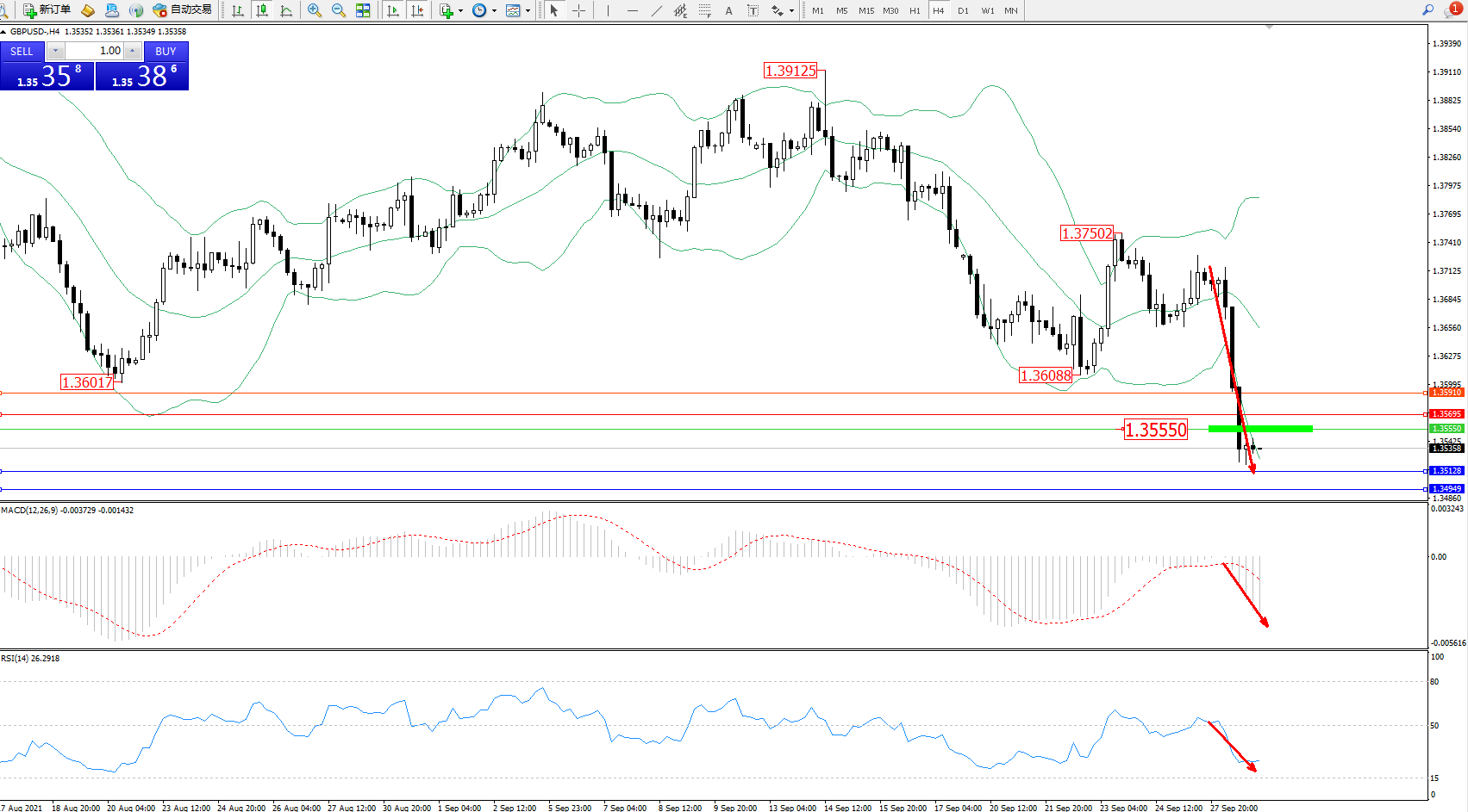 交易策略:1.35550下方看跌,目标1.35128、1.34949