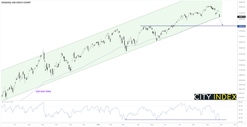 “在周二利率再度上升的环境中,纳斯达克100指数成为美国主要股指中最弱的那个。最关键的是,该股指正在考验其持续15个月的上涨通道的下轨构成的关键支撑兼100天均线所在的14700区域。”韦勒对记者称。