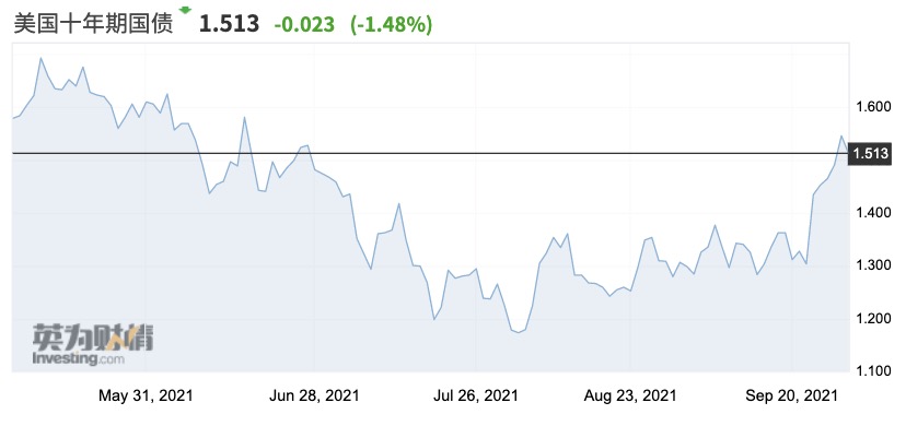 9月28日,市场对债务上限临近问题的恐慌情绪进一步蔓延,美债收益率快速飙升,纳斯达克(14512.4409, -34.24, -0.24%)100指数下跌2.9%,高成长型科技股领跌。10年期美国国债收益率一度触及1.56%创近3个月新高,较8月初的低点上行超过40个基点(BP)。截至北京时间9月29日16:15,10年期美债收益率报1.513%。华尔街分析师普遍认为,如果美债收益率继续上升,科技股抛售情况可能会更加糟糕。