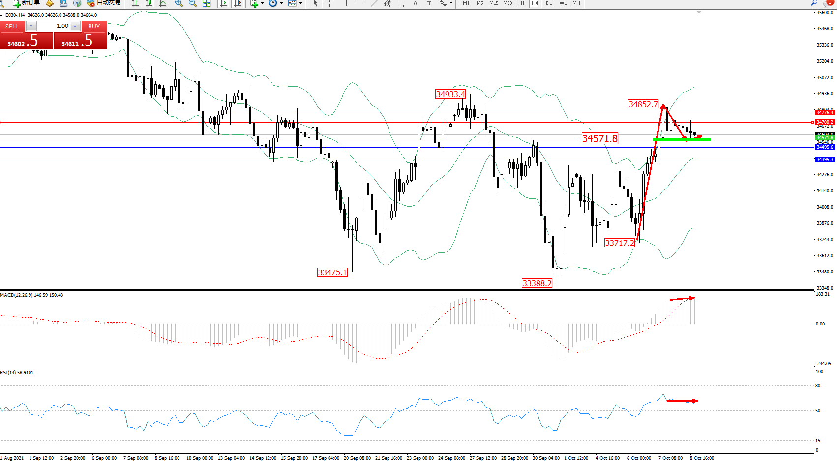 交易策略:34571上方看涨,目标34700、34776