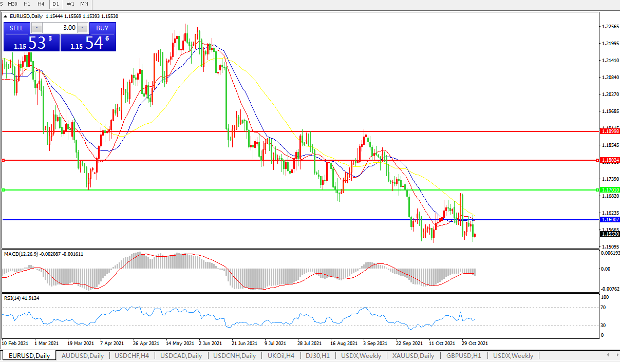 欧洲央行在收紧货币政策方面远远落后于其他主要央行,欧元一度跌至1.1528美元,为10月12日以来的最低水平,当时欧元触及了2020年7月底以来的最低水平1.1522美元。欧元兑美元尾盘下跌0.50%,报1.1554。欧元兑英镑上涨1.0%至0.8560英镑,为一个月高点。
