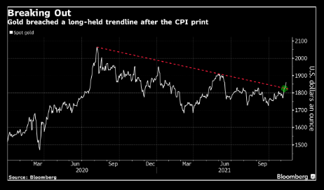 瑞银(18.1, -0.04, -0.22%)分析师Wayne Gordon等人在报告中写道,“我们认为CPI在2022年初有进一步走强的风险,这可能进一步刺激对黄金的需求。” “通胀预期放缓加上名义利率上升,应该会促使美国实际利率最终走高(并令黄金承压),但这可能需要更长时间。”