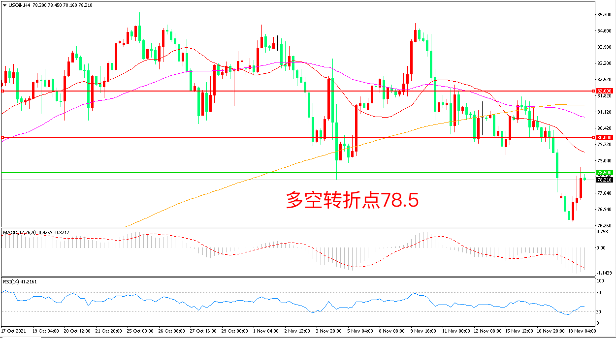 4小时图看,油价跳空低开后大幅拉升,短期走势有所回暖,但整体仍然处于空头形态制作,78.5美元成为多空分水岭,MACD绿柱缩短,RSI指标走平,日内震荡下行概率较大。