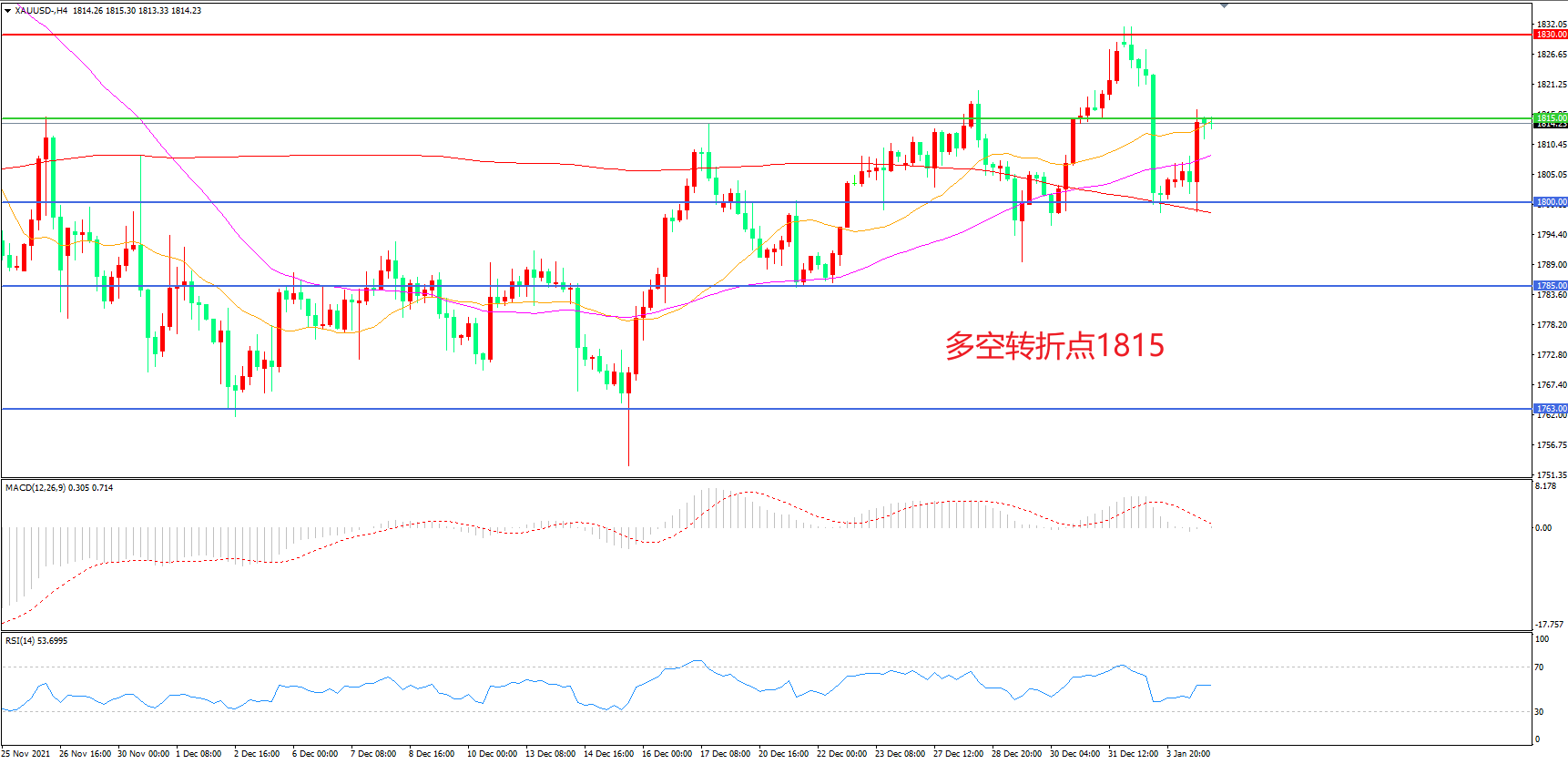 周二(1月4日),美国单日新增病例突破100万,随着奥密克戎疫情的快速蔓延,交易者押注疫情将进一步推高美国通胀,现货黄金受到提振后大幅拉升,收报1814.23美元/盎司。目前投资者仍押注美联储将提前加息,如果美联储会议纪要和非农再度利好美元,金价有可能再度出现回落。