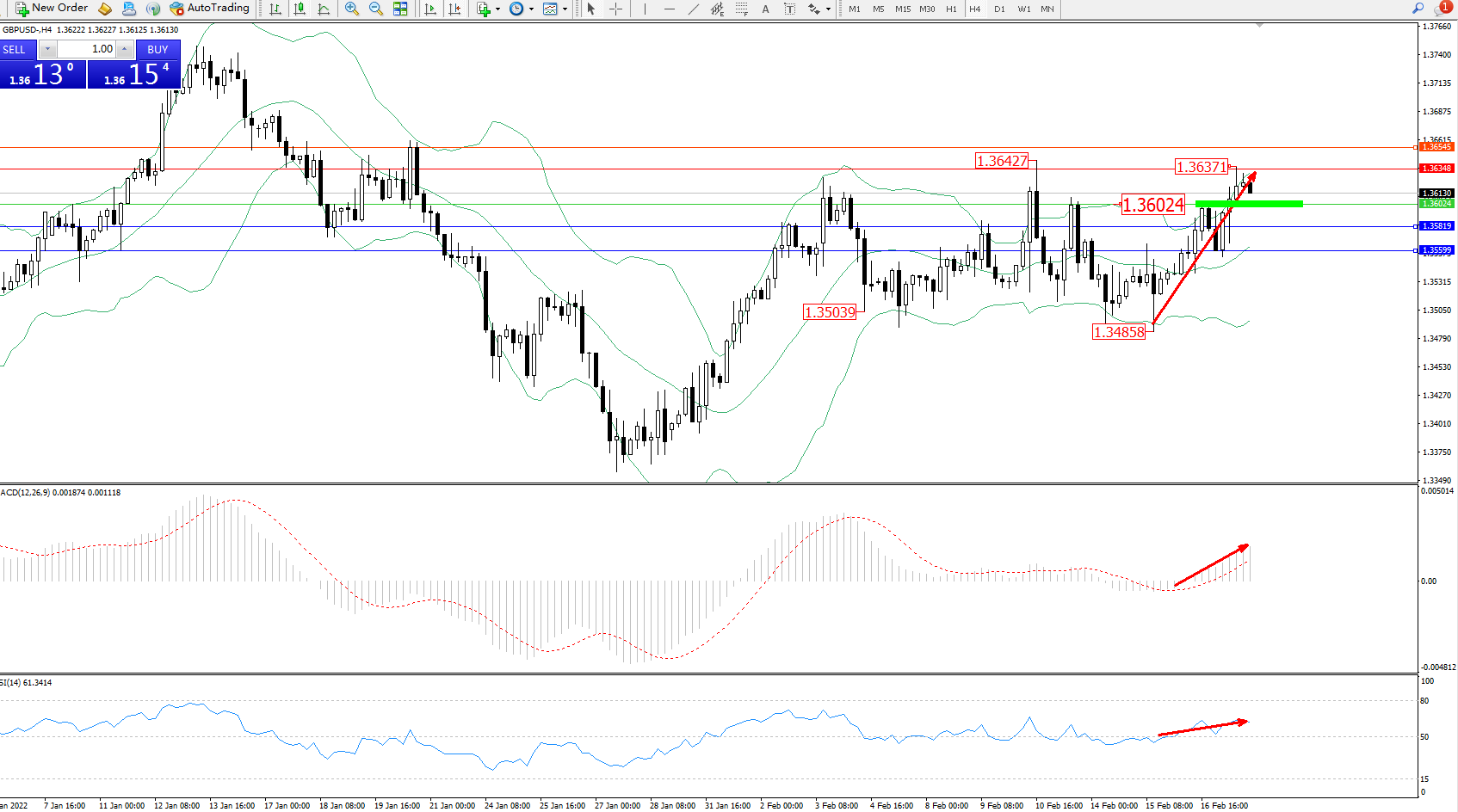 交易策略:1.36024上方看涨,目标1.36348、1.36545