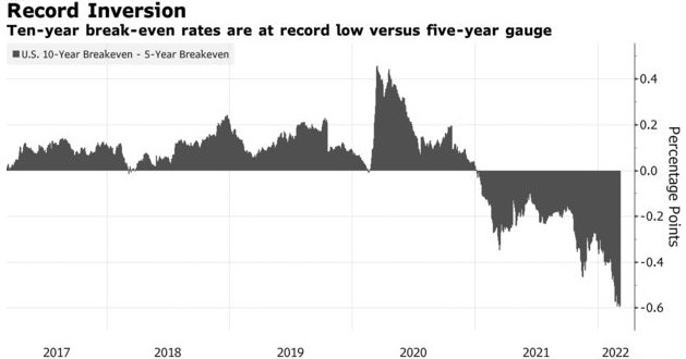 盈亏平衡通胀率曲线的倒置表明,通胀上升不会是长期的。10年期盈亏平衡通胀率比5年期的同样指标低60个基点,创历史新高。