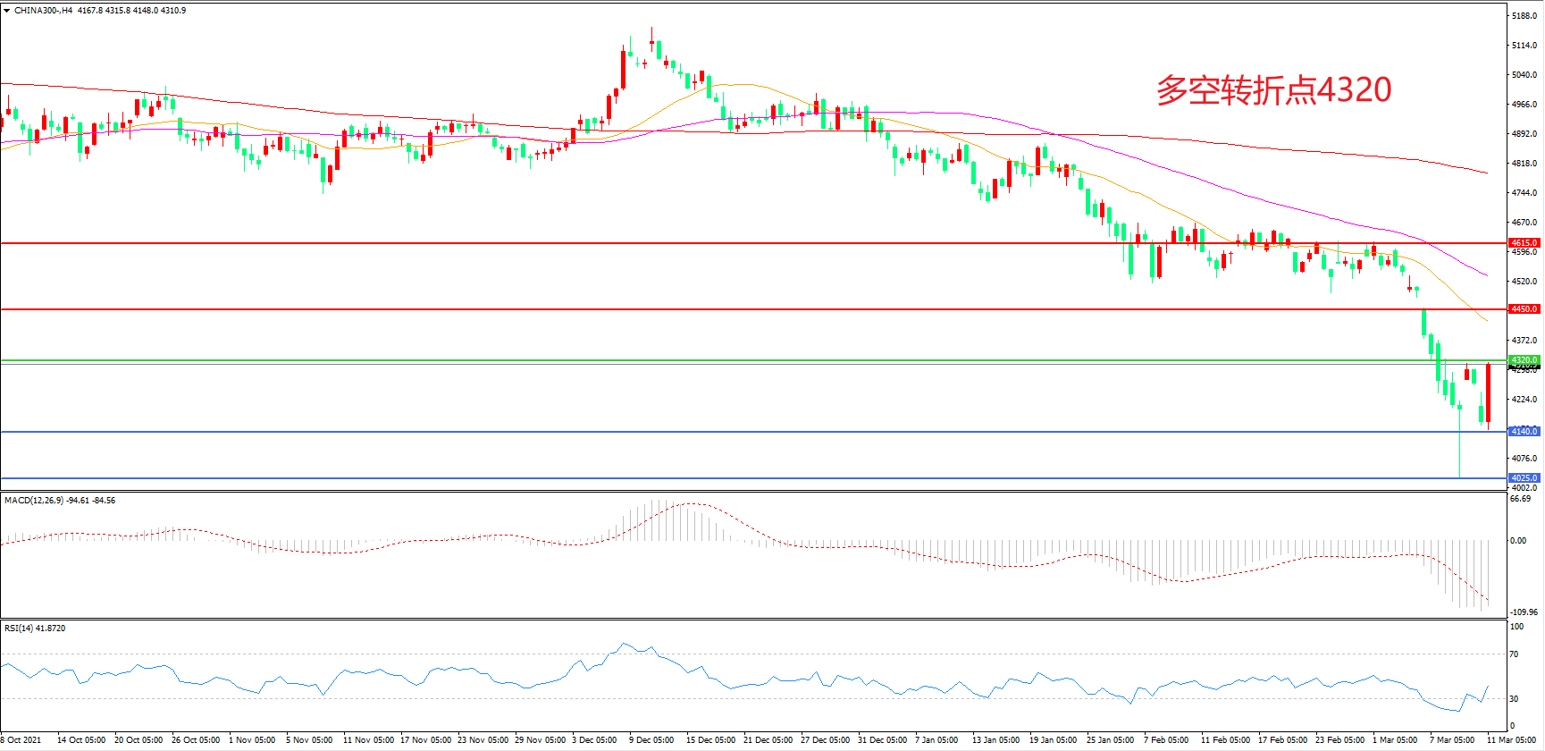 4小时图看,沪深300 回踩4140一线后大幅拉升,短线有止跌迹象,但均线系统仍呈空头排列, MACD绿柱缩短,RSI指标走平,日内延续震荡概率较大。
