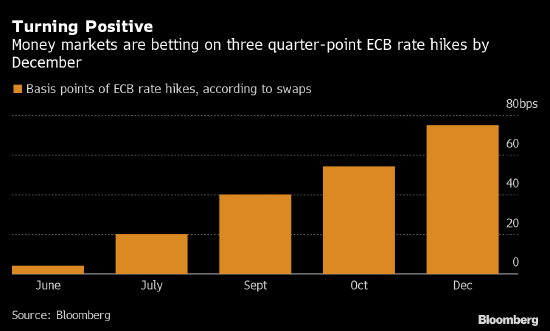 交易员们已经在聚焦7月加息的可能性,届时欧洲央行将加入美联储和英国央行退出刺激措施的行列。在欧元区,刺激措施在疫情前早已实施。该地区的利率自2014年以来一直为负值,大规模资产购买七年多来一直在进行,几乎没有间断过。