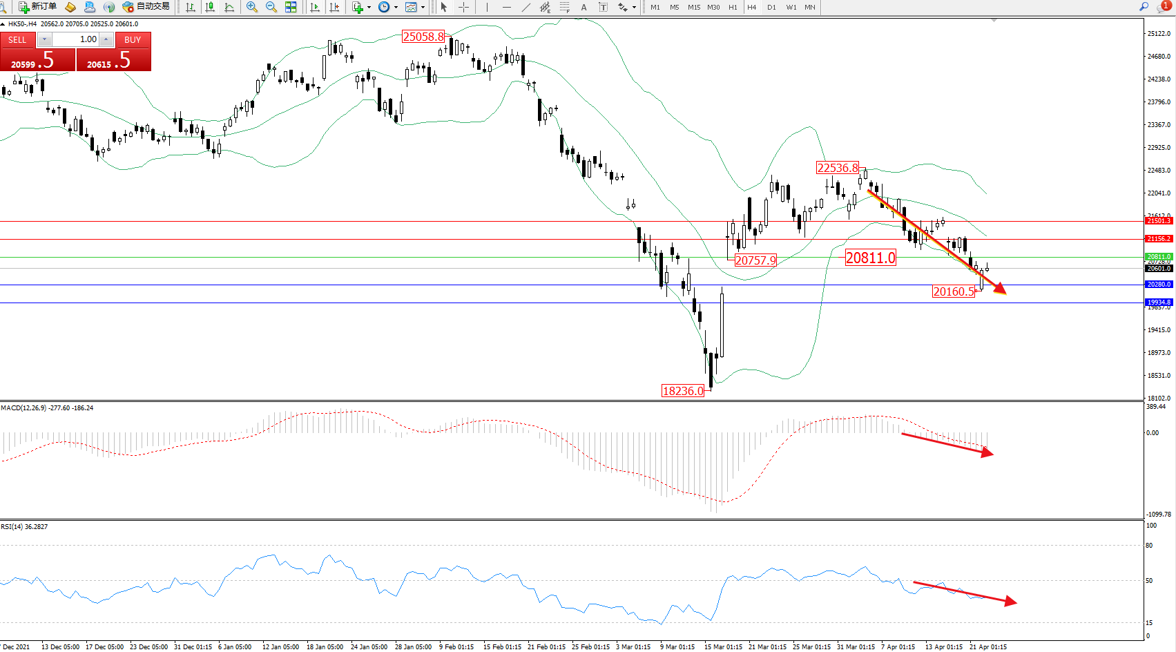 技术点评:市场空头动力持续,延续布林带指标通道中下轨区间持续震荡下行,低位抵达20160附近节点后短暂震荡,空头动力有继续向下移动态势,布林带指标呈收口走势不断向下移动中,MACD指标处于0轴线下方空头区域维持震荡向下移动中,RSI指标处于50均衡线下侧弱势震荡下行中;