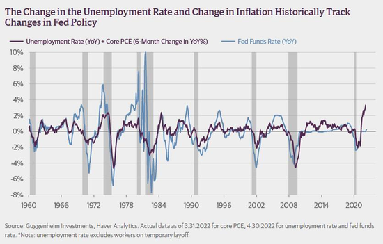 但在过去的一年里,美联储货币政策与失业率和通胀之间的关系出现了明显的分歧。面对失业率急剧下降和通货膨胀急剧加速,美联储没能快速行动。美联储行动迟缓的原因主要在意疫情的冲击,以及它们此前在观望看通胀是否是暂时的(美联储还提出了2%的平均通胀目标)。