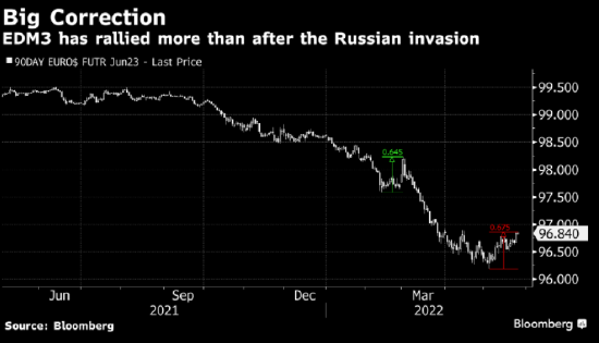 这在反映未来货币政策变化的资产价格中相当明显。例如,2023年6月期欧洲美元在上一次美联储会议时触及96.19的低点。随后一路反弹到96.865,幅度达到67.5个基点,比俄乌冲突后的幅度更大。