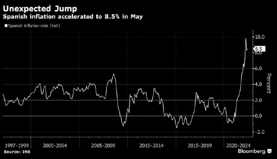 西班牙5月欧盟调和CPI从之前一个月的8.3%升至8.5%,燃料价格的上涨抵消电价下滑;此前数月,电价导致欧洲各地通胀率升创纪录。