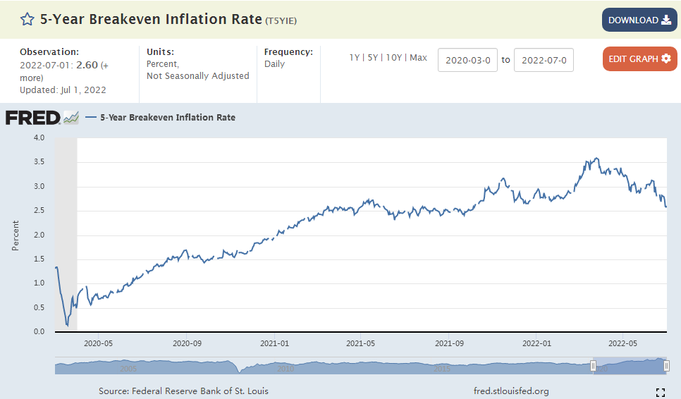 第一财经记者注意到,自美联储加息以来,中长期通胀预期逐步回落趋稳。五年期通胀保值国债(TIPS)损益平衡通胀率已经从3月末的高位回落近1%,至2.60%,纽约联储和密歇根大学的中长期通胀预期也稳定在3%左右。不过短期物价压力犹存。纽约联储调查显示,消费者对未来一年通胀的预期升至6.6%,追平2013年6月调查开始以来的最高水平,家庭消费支出预期连续第五个月升高,增幅达到9.0%。
