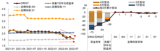 我们认为更为核心的,是通过LPR利率调降和长端国债利率下行,进一步传导回银行负债端,降低存款利率,激发资金活性,拉动实体有效投融资需求。2022年4月,央行指导利率自律机制建立了存款利率市场化调整机制[5],自律机制成员银行参考以10年期国债收益率为代表的债券市场利率和以1Y LPR为代表的贷款市场利率,合理调整存款利率水平。实际操作中,由于贷款在资产中占比较高,考虑到息差等影响,因此银行可能更倾向于参考1Y LPR进行存款利率的调整。该调整机制更新后,多数银行响应了政策号召,于4月下旬下调了1年期以上定期存款和大额存单利率,4月最后一周(4月25日-5月1日),全国金融机构新发生存款加权平均利率为2.37%,较前一周下降10个基点,但此后从融360数据反映看,存款利率整体下降速率和幅度均重新转慢,均不及货币市场利率和债券利率。比如我们看到4月存款利率市场化调整机制出台之后,多数银行于4、5月份小幅下调存款利率,不过由于负债端成本具有一定刚性,6、7月又小幅转涨,且因1年期LPR和10年期国债收益率维持稳定,短端下调激励有限,近几个月存款利率呈现“短上长下”的局面;而同期DR007自3月均值2.09%累计下行53bp至7月均值1.56%,余额宝7日年化收益率自3月的1.96%累计下行39bp至7月的1.57%。存款利率降幅偏慢,一方面在资产端利率下行较快的影响下,制约了银行息差,银行息差收窄反过来则会制约银行进一步让利实体的意愿和空间;另一方面也拖累了资金活性,实体储蓄意愿高居不下,难以转化为有效的投资和消费意愿,资金供给虽增加但并没有实现对实体投融资需求的对等拉动。从这一点看,通过名义降息,引导LPR下调,并鼓励存款利率的压降,激发资金活性,可能也是央行政策操作的核心考量之一。