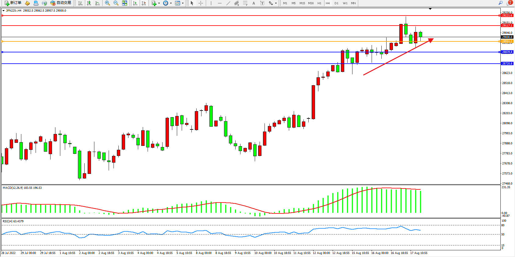 日经225指数8月17日(周三)收盘上涨335.09点,涨幅1.16%,报29204.00点。日本7月进口额跃升至纪录新高,超过了出口额,导致贸易逆差扩大,这表明日本出口导向型经济的贸易条件进一步恶化。