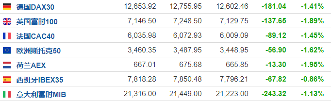 欧股跌幅扩大,法国CAC40指数日内跌幅达1.45%,英国富时100指数跌1.89%,欧洲斯托克50指数跌1.62%。