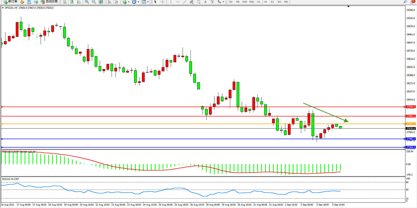 日经指数JPN225——4小时K线图显示: