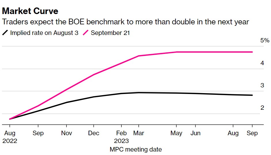 英镑贬值以及美国、欧盟、瑞士和瑞典等地区央行利率飙升,正给英国央行施加压力,要求其加快紧缩步伐。英国央行预计,英国经济前景将从第四季开始陷入衰退,这加剧了要求谨慎行事的声音。