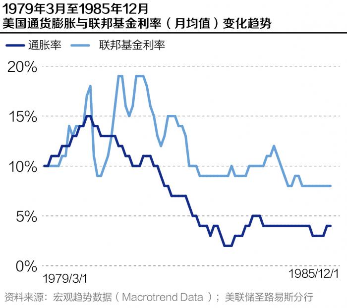 在治愈长期困扰美国经济的高通胀问题方面,沃尔克主席确实取得了非凡成就。沃尔克于1979年8月6日至1987年8月11日期间担任联储主席。他刚上任时,以消费者价格指数测算的通货膨胀率高达11.84%(为1975年1月以来的新高),联邦基金利率为10.72%。当年11月4日,伊朗发生革命,德黑兰大学生扣押了57名美国外交官和公民,事件导致美国和伊朗关系交恶,国际市场上原油价格暴涨,增加了美国国内通胀压力。1980年3月,美国通货膨胀迅速升至14.59%,为1948年以来的最高纪录。在沃尔克主席主导下,联邦基金利率(实际)由他上任时的10.72%被推高至1980年3月末的19.85%。即使后来通胀压力整体减缓,如1981年7月降至10.77%,而联邦基金利率仍维持在21.09%(7月1日)。1981年11月之后,美国通货膨胀彻底告别了双位数时代,而联邦基金利率直到1983年1月2日才降至个位数。