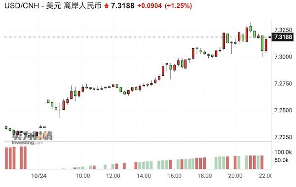 10月24日晚间,离岸人民币(7.3051, 0.0492, 0.68%)对美元跌破7.3关口。截至北京时间24日22:25,美元/离岸人民币报7.3202。