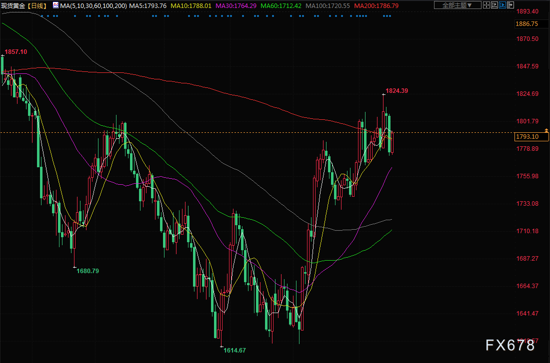 黄金周五反弹,但本周创11月中以来最大周跌幅,之前美联储表示需要进一步加息来抑制通胀。现货金上涨0.8%,至每盎司1791.59美元,但本周已下跌约0.3%。OANDA的高级分析师Edward Moya说,“很多交易员都在关注美联储和欧洲央行,它们暗示会进一步收紧政策,我们看到全球债券收益率大幅上升,这就是黄金本周下跌的原因。”