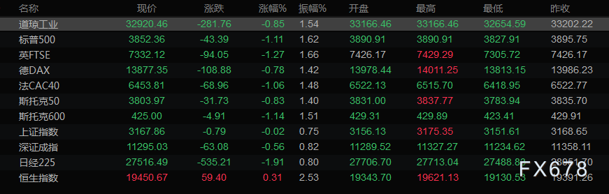 商品收盘情况:布伦特原油期货结算价报每桶79.04美元,下跌2.4%,美国原油期货下跌2.4%,结算价报每桶74.29美元。美国期金收报每盎司1800.20美元,上涨0.7%。美股收盘情况:道琼斯(32920.4609, -281.76, -0.85%)工业指数下跌0.85%,至32920.46点;标普500指数下跌1.11%,至3852.36点;纳斯达克(10705.4141, -105.11, -0.97%)指数下跌0.97%,至10705.41。