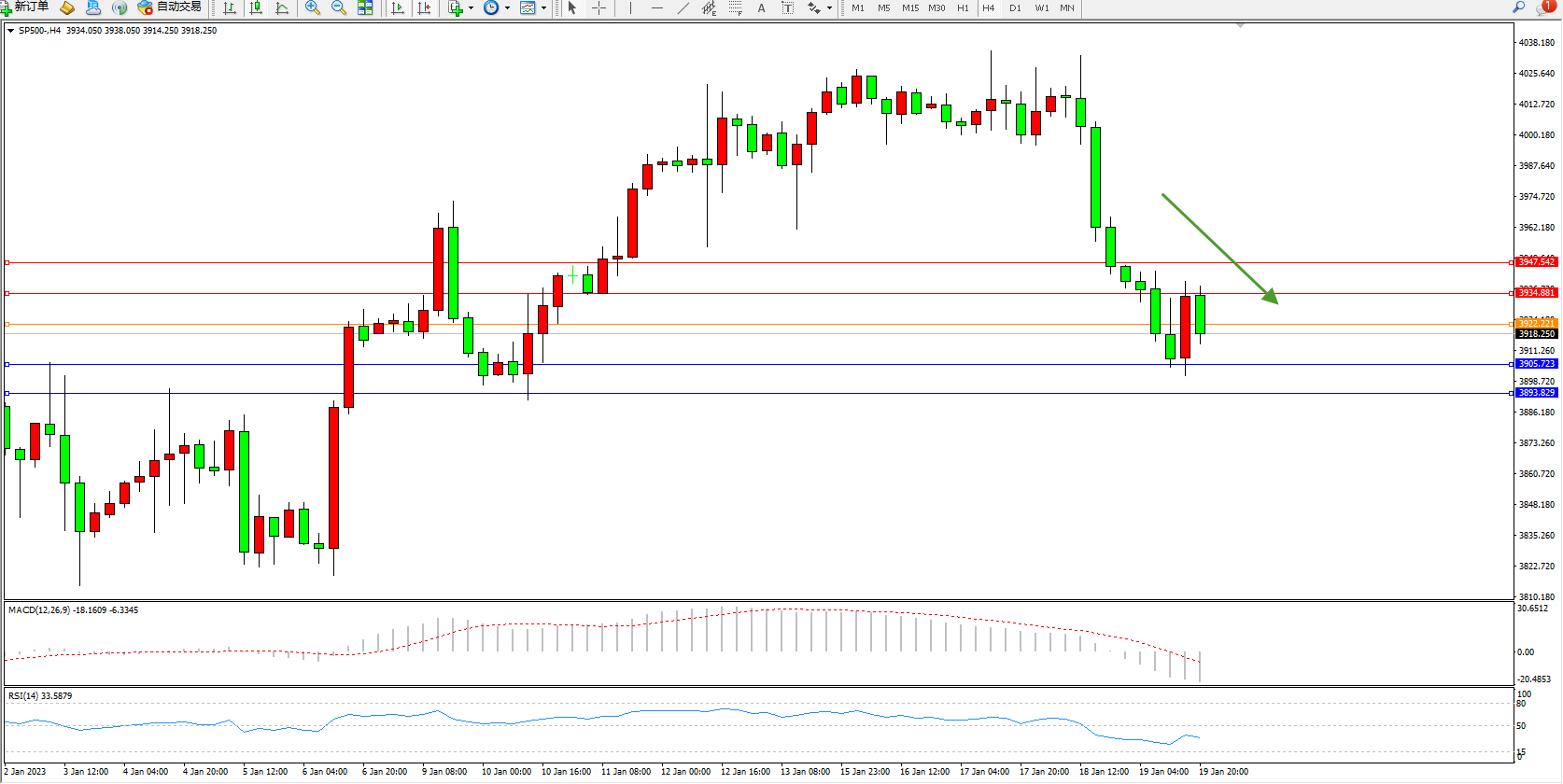 标普500指数1月19日(周四)收盘下跌30.26点,跌幅0.77%,报3898.60点;美国新屋开工量连续第四个月下降,为房地产行业令人失望的一年画上句号,新屋开工量自2009年以来首次下降。上月新屋开工年率下降1.4%,至138万户,为五个月低点