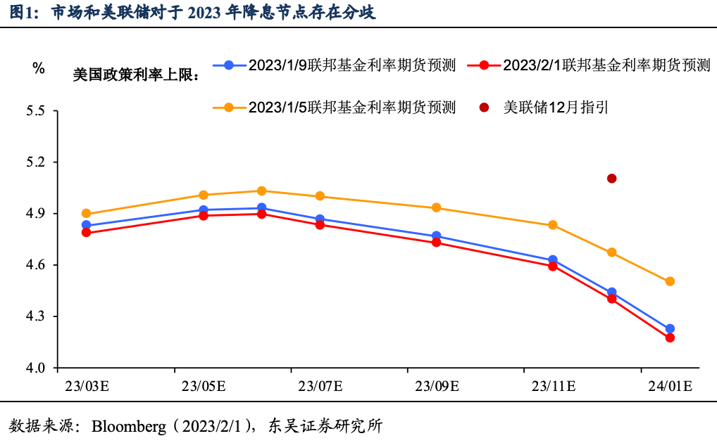 仍有两次加息的空间,年内降息的可能性有限。这是美联储和市场最大的分歧所在,市场依旧认为本轮加息周期的顶点可能不及5%(这意味着3月之后至多还有一次加息),且下半年将转向降息,但在美联储看来这是偏乐观的,会议继续表示2022年12月议息会议对利率峰值的预测(5%-5.25%)是合理的(这意味着还有两次25bp的加息空间)。