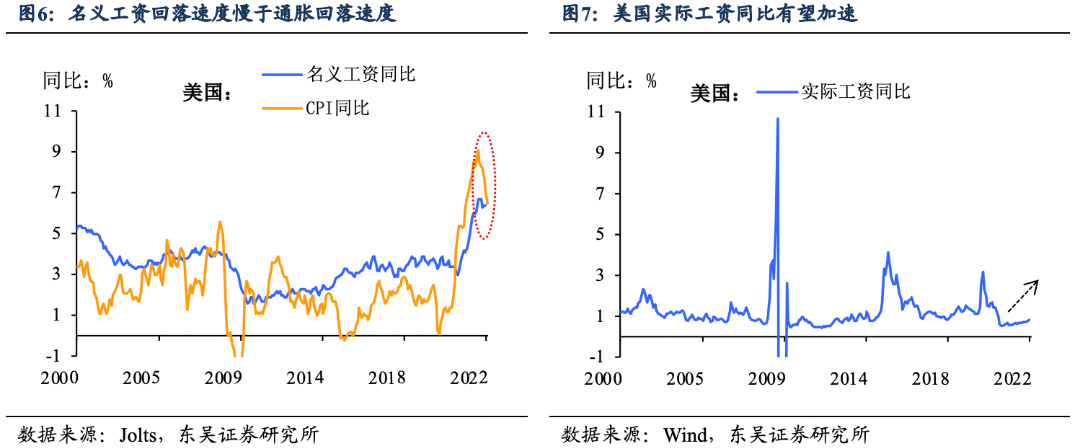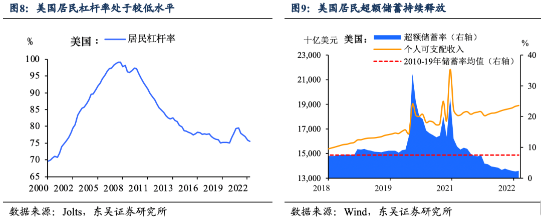 实际薪资上升将增加经济“软着陆”的可能性。就业稳健和通胀加速回落,将导致名义工资增速的放缓要明显慢于通胀,这反而会使得实际工资增速上升。若实际工资持续增长,叠加居民储蓄率及杠杆水平较低的支撑下,2023年美国经济“软着陆”的概率将大大提升。