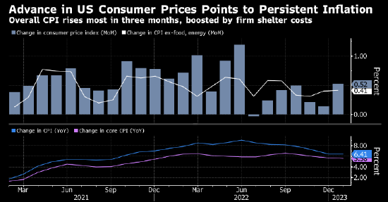 这些数据叠加1月就业报告远超预期和消费者保持韧性的迹象,凸显了经济和价格压力的持久性,尽管美联储进行了大力紧缩。该数据对官员们近期的主张构成支撑,他们近期表示,他们需要进一步加息并在一段时间内保持高利率,而且利率峰值可能会高于先前预期。