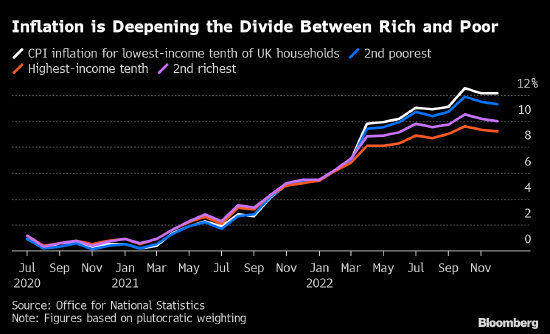 根据英国国家统计局的数据,在截至12个月的12个月里,最贫困10%家庭所面临的消费者价格指数跃升了12.1%,但最富裕10%的家庭则攀升了9.2%。12月整体通胀率为10.5%。