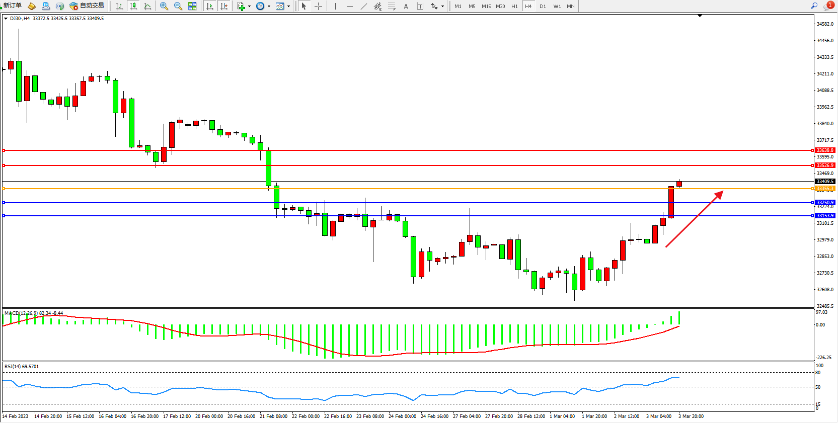 道琼斯指数3月3日(周五)收盘上涨386.78点,涨幅1.17%,报33390.35点;美国服务业商业活动在2月份恢复增长,这是8个月来的首次,抵消了制造业产出的下降,有助于稳定经济,并有望避免第一季度的衰退。
