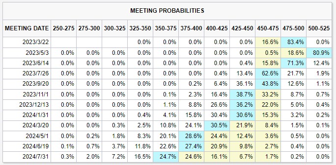 在数据公布之后,CME“美联储观察工具”显示,目前市场预期美联储将在3月份会议上加息25个基点的可能性为83.4%,维持利率不变的可能性为16.6%。其次,市场预计利率将于5月份达到5.25%的峰值。