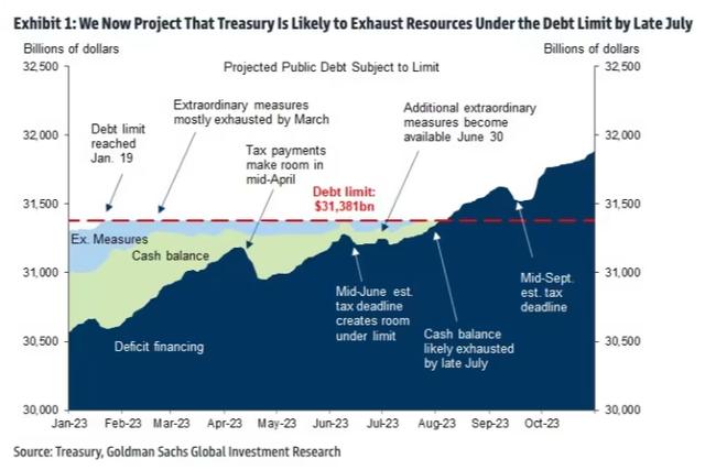 Hatzius表示,所得税收入情况不及预期,6月上半月较有可能达到所谓的“X-date”(联邦政府使用额外手段至无法履约的到期日),Hatzius解释称: