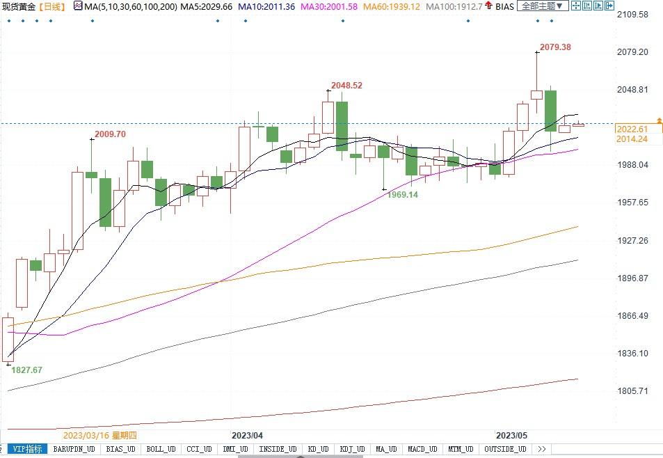 现货黄金日线图北京时间5月9日10:14,现货黄金报2022.58美元/盎司