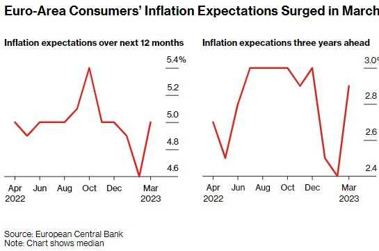 欧洲央行的月度调查显示,3月份,消费者对欧元区通胀的预期“显著”上升,这支持了欧洲央行官员的说法,即利率上升可能需要持续到夏季之后。