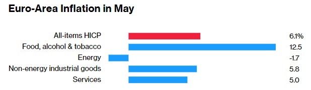周四公布的数据显示,主要受能源成本下降的推动,欧元区5月调和CPI同比增长6.1%,预期6.3%,前值为7%,为一年多来的最低水平。不包括燃料和食品在内的欧元区5月核心调和CPI同比增长5.3%,预期为5.5%,前值为5.6%。