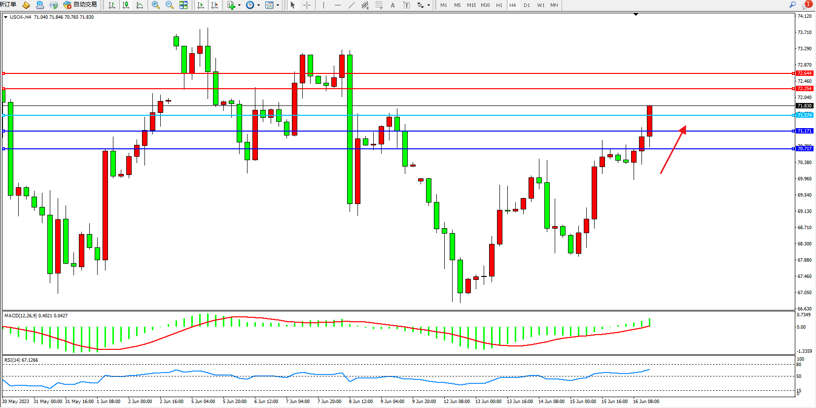 原油USOil——4小时K线图显示: