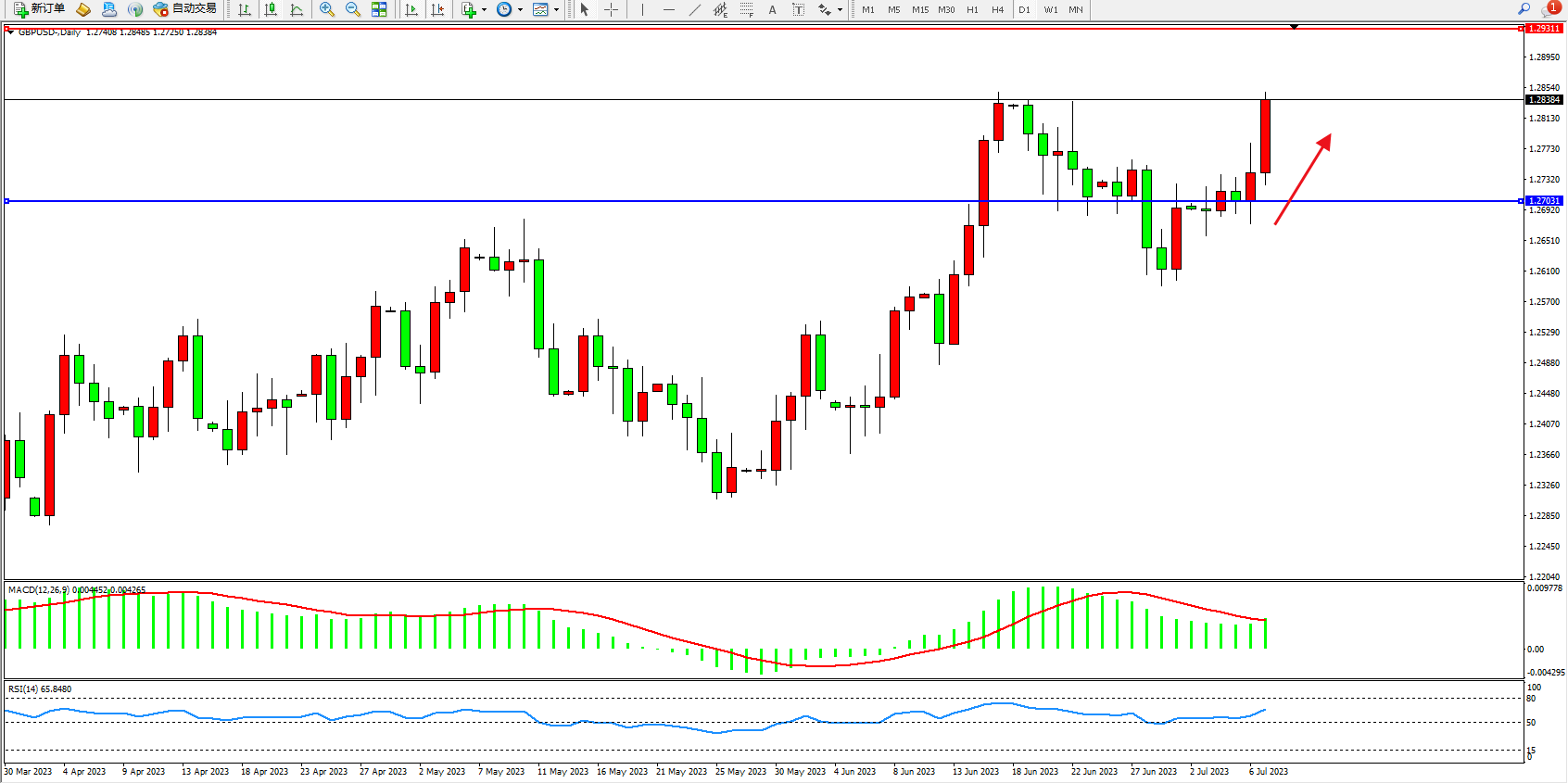 多头动力强势拉升,市场看涨情绪依据,短期有继续向上移动态势,上方压制关注1.29311附近,低位支撑关注1.27031附近,MACD指标处于多头区域维持整理,RSI指标处于多头区域缓慢上行,如图: