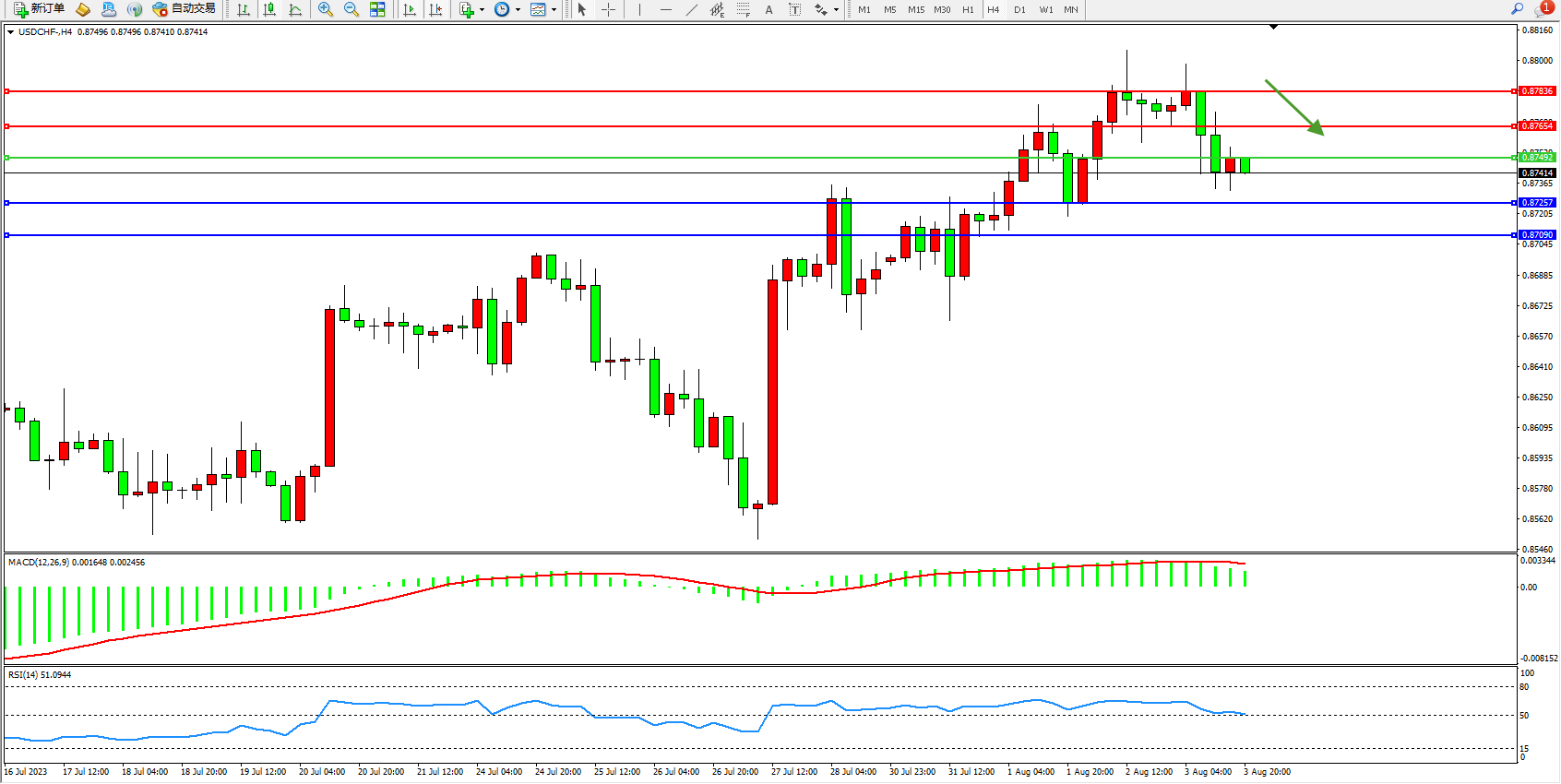 美元瑞郎USDCHF——4小时K线图显示: