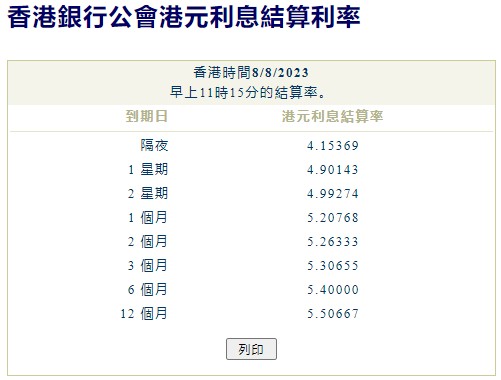 8月8日,港元(7.8145, 0.0008, 0.01%)拆息连续三天全线下跌后,今日中期息略为反弹。香港银行公会数据显示,隔夜息跌至4.15369%,创近四周新低,两周拆息更跌穿5%,报4.99274%。与楼按相关的一个月拆息结束三连跌,由近两周低位轻微回升至5.20768%,与同期美元LIBOR息差收窄至22基点。反映银行资金成本的三个月拆息微升至5.30655%,与同期美元LIBOR息差略为收窄至33基点。长息方面,六个月升至5.4%,但一年期降至5.50667%。