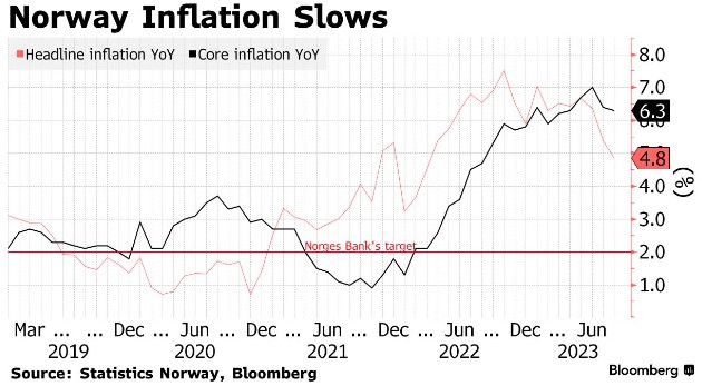 挪威上月通胀意外放缓,表明挪威央行可能在下周加息25个基点后结束货币紧缩政策。根据挪威国家统计局周一发布的一份声明,8月份总体通胀同比降至4.8%,创17个月新低,核心价格涨幅放缓至6.3%。这两项指标都低于对10位分析师的调查和挪威央行的预测,预期分别为6.1%和6.4%。